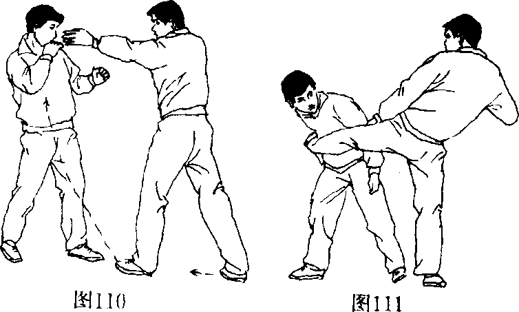 (1)乙用右侧丁腿攻击甲小腿甲后退避之待乙脚落地时进步用横丁腿攻击胸部(图108、109)。甲乙交替练习。