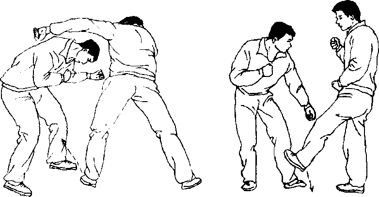 (3)甲左摆拳攻击乙面部乙用摇闪避开来拳甲不等乙起身站稳就用左丁腿攻击乙小腿(图112,113)乙趁甲脚落地时用右摆拳攻击甲面部甲摇闪避之随即用丁腿攻击乙小腿。如上反复数次为一组。待熟练后可配合步法练习。
