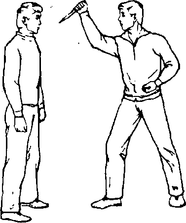 开始动作:对手右手正握匕首,向則上右步,由你左肩外向 右下斜刺你肩(胸)部(图768)。反击动作顺序:图768图768(1)你立即向对手右脚外侧上左步,左闪身,右手由外侧抓 握其右手腕(图769)。图768图768(2) 左手由下向上用掌心托(击)对手右肘,同时右手下压 其右手腕(图770)。要点:上步、闪身快,抓腕牢,托(击)肘狠,压腕有力。