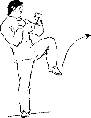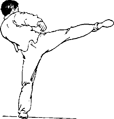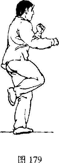 左腿直立或稍屈支撑,上体左转180°,稍向左侧倾,同时右 腿屈膝前摆,扣膝,绷脚背,随即挺膝向前弹踢小腿,力达脚背 至小腿下端(图179、图180)。