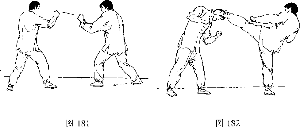 例(1)冲拳接侧弹腿:先用左冲拳击(虚晃)对方头部或 躯干,继而右脚跟步,左侧弹腿攻击其头部(囝181、图182)。