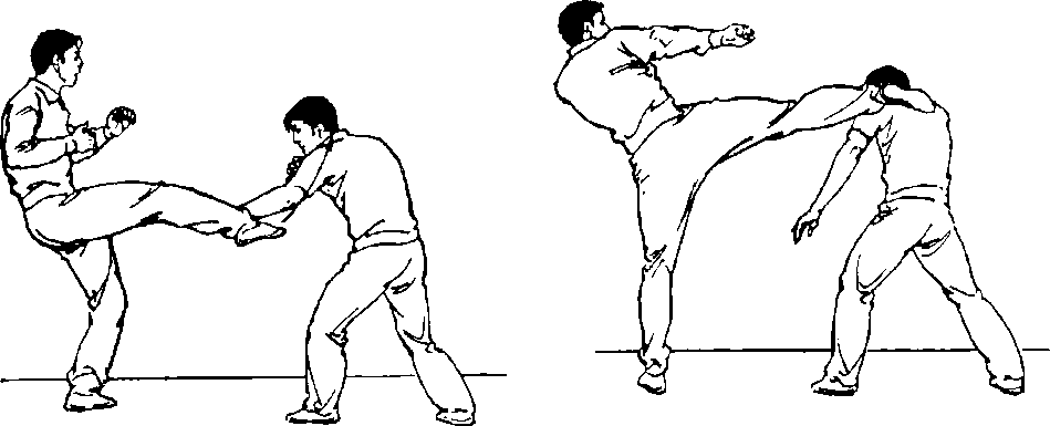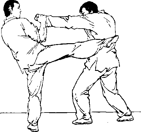 例(3) 防腿反击侧弹腿: 当对方用横扫腿进攻时,两手抄 抱防守,随即侧弹腿反攻其腹部 (图 184、图 185)。