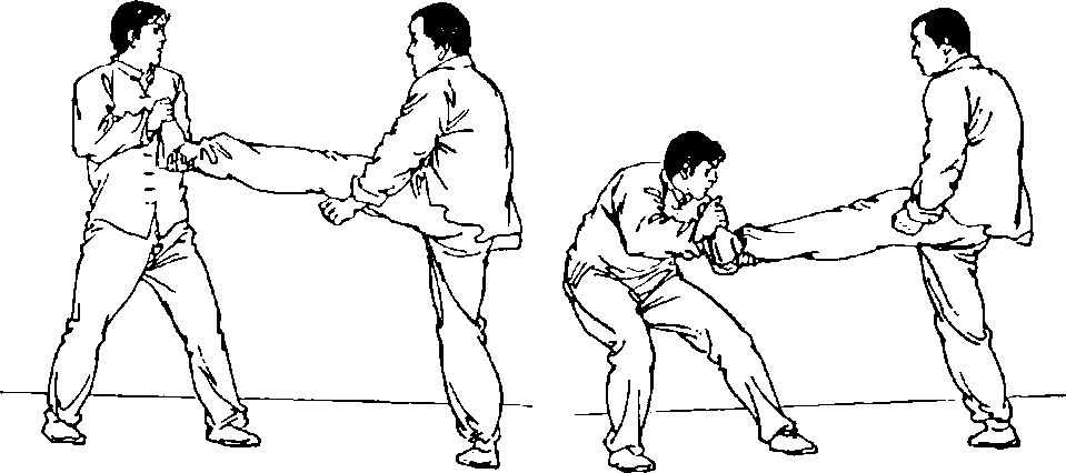 凼甲用左蹬腿踢乙胸部开 始。乙立即用两手抓握甲左脚, 两腿屈膝,两手向右侧拉其右 脚,随即向下、向左上方成弧形 摆荡(图223?图225)。图223 图224要点:抓握要准确、牢固,右拉和弧形摆荡动作要连贯有力。 易犯错误及纠正方法:摔不倒对方:弧形摆动要协调一致,注意借用对方反抗力量。 运用:多用于接抱对方蹬腿、横打腿等。