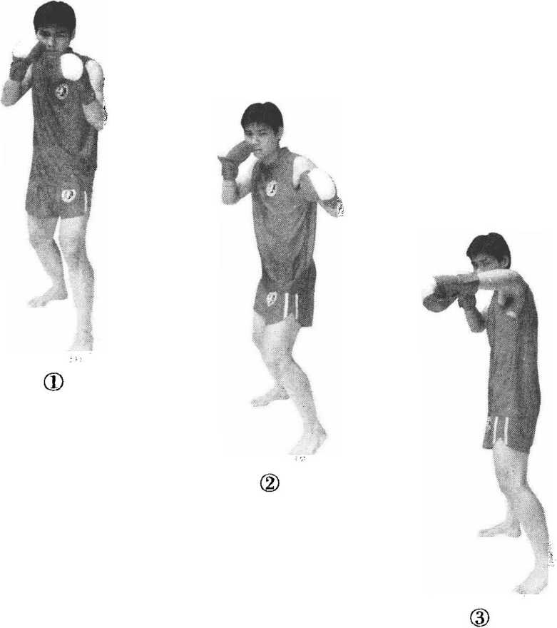 左势站立左脚蹬地身体右转同时左臂抬起左拳向内弧形横击右拳自然收于下颌旁。(图2-23123)图2-23