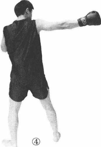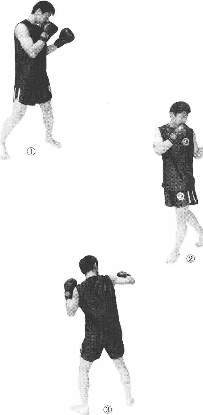 以右转身鞭拳为例。左实战势站立左脚支撑身体向右向后转动右脚经左腿后插步身体继续向后转同时以腰带动右臂顺时针横向鞭击左拳自然收于下颌旁。(图2-311(3))动作要领转体、插步要快重心要平稳手臂沿平圆抡击。图2-26运用举例以鞭拳击打对手头部侧面。