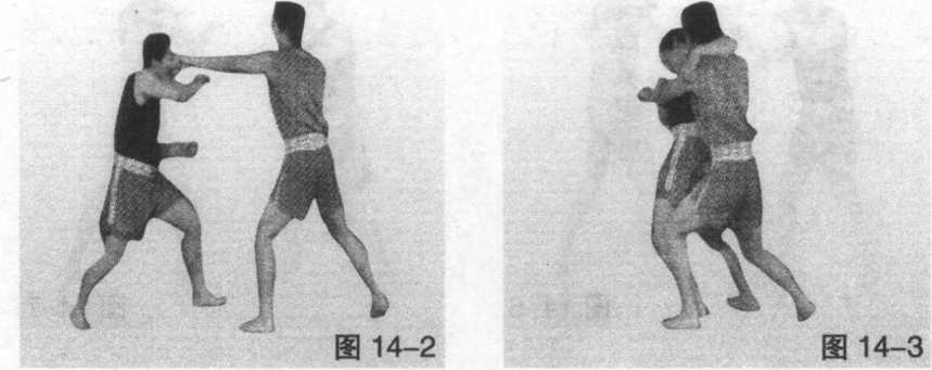 1进左脚插右脚,左臂夹紧对方颈部,臀部紧贴对方腹部 (图 14-2 至图 14-3 )