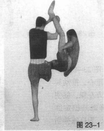 当对方左正蹬腿进攻时,我方左斜前进步,右臂挂抱对方左 大腿,左臂搂抱对方支撑腿膝窝处。左转腰左手回搂对方支撑腿 膝窝处,同时右臂上举,将其摔倒。