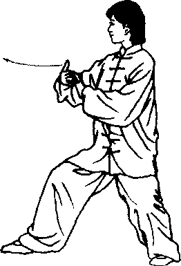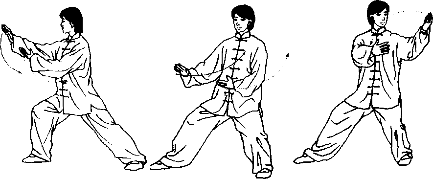 步法:随上体先微微右转再左转,左膝渐屈,重心左移,右腿自然 伸直。