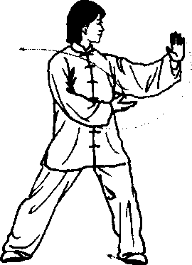此式在定势前,应配合松腰松胯和沉气来完成边转体边翻 掌继而前推的动作,到定势时,左掌要坐腕、展掌、舒指。