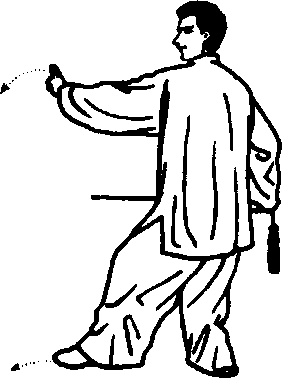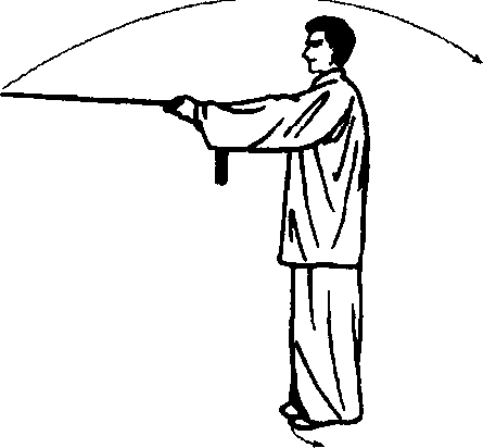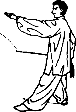 先回收左剑指,然后成左虚步;左手剑指前指时右手持剑须 继续向身后回抽,左手剑指和右手回抽及左脚尖点地要同时到 位。定式时,重心应在右腿,上身要正直,注意不要突臀。
