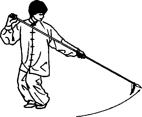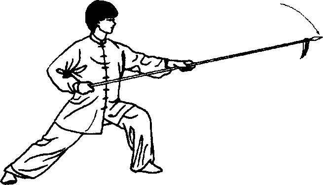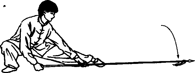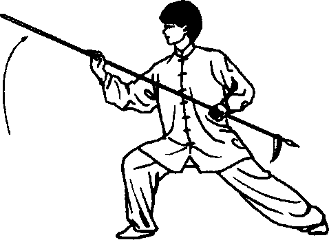 两手握枪,由上向下运行。劲运于枪前段与枪尖。图77.拉枪(图8)后手握把回抽,前手滑握枪身中段,使枪贴身,斜置于体 侧,枪尖朝后下方。8 .扑枪(图9)枪身由上向下落至接近地面,不可触地。9.挑把(图10)枪把由下向上运行,劲运于把端。图io