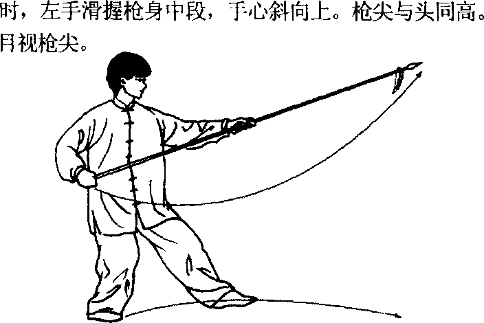 枪法:随右脚上步,右手滑握枪身中段,随即屈肘使枪把由下向上 挑起,手心斜向外,把端与头同高。同时,左手握枪顺势收 置于左腰前,手心斜向上。