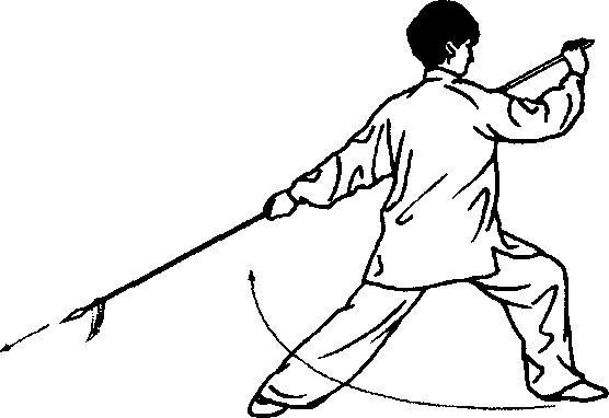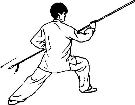 枪法:随右腿屈膝向左后举起,右手握把移向右耳侧,左手滑握枪 身后段,两手使枪向左下扎出,枪尖离地约30厘米。