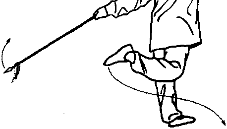 2、 学习动作二。注意重心移向左腿动作要轻灵。独立要稳定。 扎枪时左手滑握后要牢固支撑,右手移向右耳侧要向左下用力,使 力达枪尖。练习时注意重心移动不要太快,使左腿能平稳支撑;右 大腿、小腿要尽量向左后抬起。头部要随着扎枪转动。