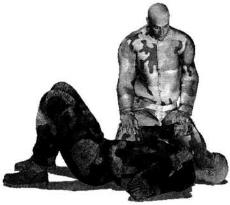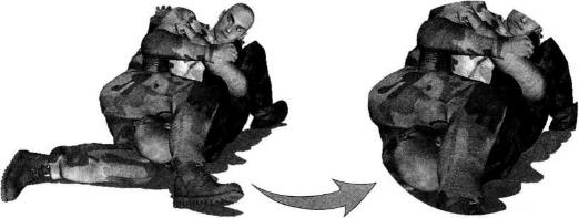 地面缠斗中对手仰躺于地面我跪扶于对手身体右侧伺机而动(图2-3-15)。然后迅速向前扑压在对方身体上准备展开压制或进攻但是对方出于本能会用左手使劲推阻我上体或前胸极力反抗挣扎我可以顺势双臂屈肘双手合拢