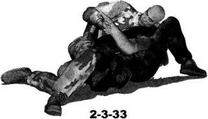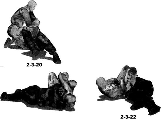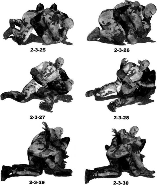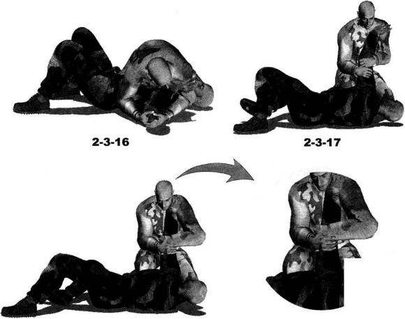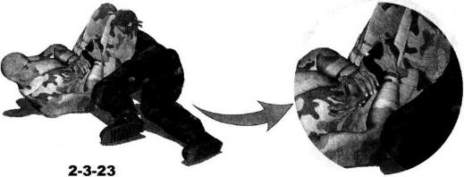 2-3-152-3-15(图2-3-21、图2-3-22)。然后双腿膝部并拢夹紧对方大臂根部左手用力向右翻拧推送其左手腕使其左臂肘关节外侧垫在我右大腿内侧令肘关节被反关节别折(图2-3-23、图2-3-24)。