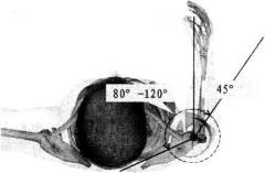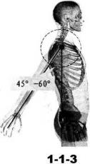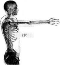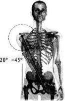 在矢状面内绕冠状轴上臂可做屈伸运动。前屈运动范围约90度角(图1-1-2)后伸时由于受到关节囊前壁与肱骨头及喙突结节的限制运动范围较小45-60度角(图1-1-3)。此时肩胛骨保持不动如超过此运动范围则肩胛骨参与运动做回旋和伸缩运动。