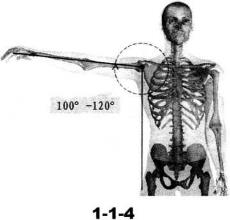 在冠状面内绕矢状轴上臂可做内收与外展运动。此时肩胛骨固定肱骨头在关节窝内做上下滑动。外展时肱骨头向下方滑动因受肩峰阻挡其运动范围为100-120度角(图1-1-4),如果继续上抬至180度角则上肢必须转动内收时肱骨头则滑向上方由于受躯干的阻碍其运动范围为20-45度角(图1-1-5)。