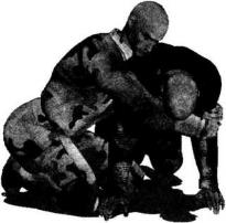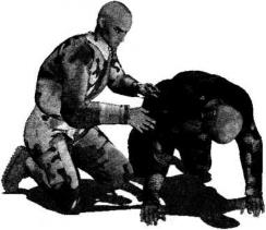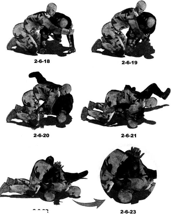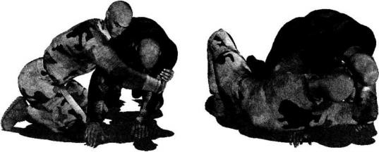 2-6-172-6-17双方于地面展开搏斗对手双腿屈膝跪伏于地双手以手掌扶撑地面呈犬式防守状态我跪于其身体右侧(图2-6-17)。发动进攻时上体前探左手自对方右侧腋下穿过经其胸腹下方伸展至其左腋侧同时右臂经对方脖颈下方穿过顺势用双手揽抱住对方左大臂外侧(图2-6-18)。随即双臂用力收拢双手向后、向怀中拉扯对方左肩臂部位同时上体前顶破坏其身体的平衡周身协调动作瞬间令对方身体向右后方翻转过来仰面摔躺于地面(图