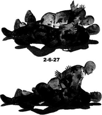 双方于地面展开搏斗对手两腿屈膝跪伏于地两手以手掌扶撑地面呈犬式防守状态我跪于其身体右侧上体前探左手自对方右侧腋下穿过经其胸腹下方伸展至其左腋侧同时右臂经对方脖颈下方穿过顺势用双手揽抱住对方左大臂外侧(图2-6-24)。随即双臂用力收拢双手向后、向怀中拉扯对方左肩臂部位破坏其身体的平衡同时身体向左侧翻转以右侧身躯着地周身协调动作瞬间令对方身体由我身躯上方翻滚至我身体左侧仰面朝天(图2-6-25-图2-6-27)。对手后背着地的同时我也随之一并滚动身躯