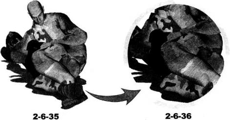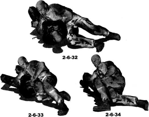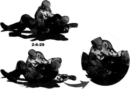 (图2-6-28)身体翻转过来之后立即向右转动右腿向右前方伸展左脚向左后方摆动以右侧臀部着地双腿展开呈人字形双臂圈锁住对方双臂肘关节部位实施别锁(图2-6-29-图2-6-32)。进一步在牢牢控制住对方双臂的前提下可以抬起左腿勾挂住对方脖颈并用左脚踝勾住自己右脚踝针对其脖颈实施扼绞(图2-6-33-图2-6-36)
