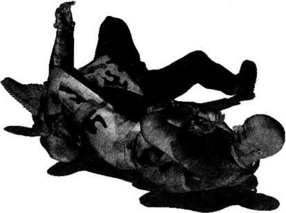 身体在翻滚与摆转过程中双臂要始终牢牢控制住对方的双臂切勿松脱。双腿绞住对方脖颈后双臂要用力向怀中揽抱对方双臂肘关节部位上体后仰挺腰送瓶配合发力。