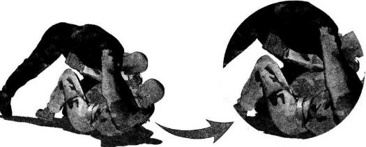 双脚蹬地跃起时双手一定要牢牢拉扯住对方上体充分利用悬空后滚翻产生的动势带动对方身体一并翻滚才能达到掀翻对手的目的。我身体触及地面瞬间双腿要迅速合拢夹住对方右臂不放。