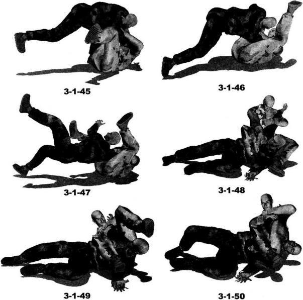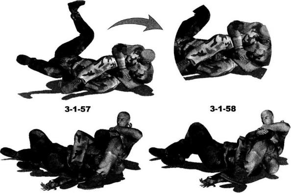 56)。后空翻动作结束时以身体左侧着地双腿顺势并拢夹住对方右臂(图3-1-57、图3-1-58)。随即在对方后背接触地面瞬间我身体向右转动双脚脚踝勾搭在一起双臂揽控住对方右臂同时发力向怀中揽抱双膝并拢夹紧臀部贴紧对方的右肩胛骨部位腰部前挺以小腹、耻骨为支点用力向前抵顶对方大臂外侧头部抬起上体顺势向后仰躺形成十字臂锁(图3-1-59、图3-1-60)