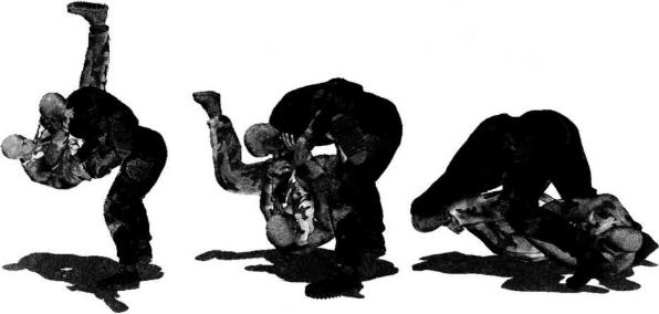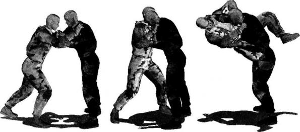 双方交手互相撕扯我左手扣按住对方右臂肘关节部位右手抢抓其胸襟(图3-1-51)发动攻击时左脚突然向前上步身体逼近对方(图3-1-52)随即在双臂牢牢拉扯住对方上体的前提下双脚猛然蹬地跃起身体于空中完成后空翻动作利用自身的悬空翻滚带动对方身体向前翻滚仰摔过来(图3-1-53-图3-1-
