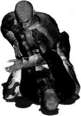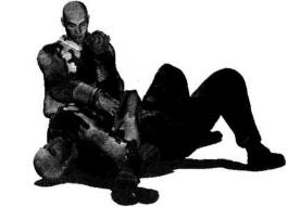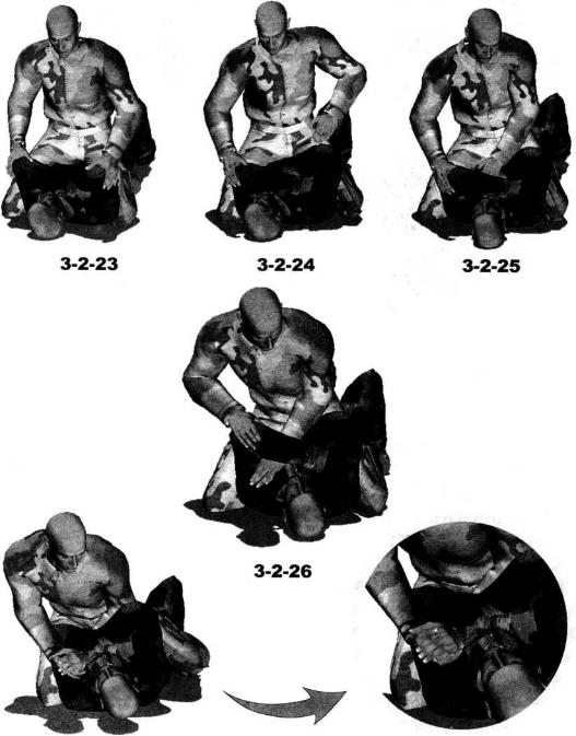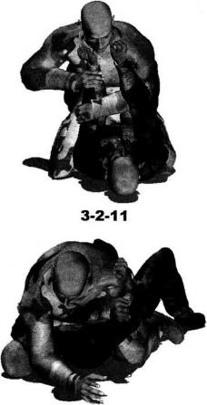 3-2-203-2-20双方展开地面缠斗时我占据主动取得骑乘优势将对方置于身下对方双臂屈肘交叉环抱于胸前防守严密(图3-2-20)为了能够顺利施展臂锁技术必须首先突破防守如果用双手推不开对方双臂我可以将上体前俯双臂屈肘合力按住对方头顶带动上体向前滑动以髓骨推开对方夹紧的双臂(图3-2-21)。随即迅速用右手扶撑地面将跪地的左腿向前移动(图3-2-22)。动作不停仰起上身然后用双手同时抓住对方双臂肘尖部位前推同时将跪地的右腿向前移动双腿夹紧对方双腋窝位置这一系列连贯动作可以有效地破坏对方双臂的防守使其交叉的手臂间产生空隙(图3-2-23)。我右手前推左手顺势穿插至对方左臂肘窝之内(图3-2-24-图3-2-26)随即右手与左手扣握在一起身体猛然左转双臂合力向怀中揽拉对方左臂迫使其左臂伸展开来