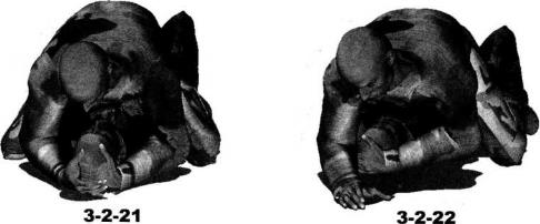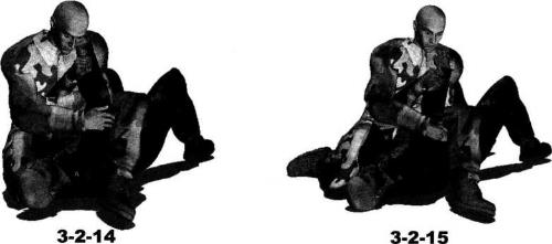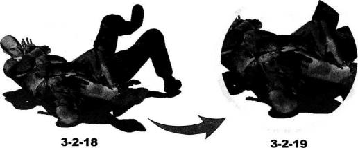 (图3-2-10、图3-2-11)。随即左手向左拉扯对方左臂右手配合左手动作一并向左推送其左手腕部迫使其左手放松对我的抓扯在其手臂被推倒的瞬间我上体迅速前俯并向左侧摆转右臂屈肘扶撑对方头部右侧地面以胸部向下压制住他的左臂(图3-2-12、图3-2-13)。继而在牢牢控制住对方左臂的前提下上体仰起腰胯向左侧拧转左膝随身体转动而外旋离开地面右腿屈膝前提以膝盖抵顶对方左侧脖颈身体由骑乘势转换为侧骑乘姿态同时右手自下而上抄揽对方右臂(图3-2-14)。动作不停右手用力向怀中拉扯对方右臂外侧左腿向右侧移动顺势楔入其右肩胛骨外侧(图3-2-15)。然后身体左转双臂在牢牢控制住对手双臂