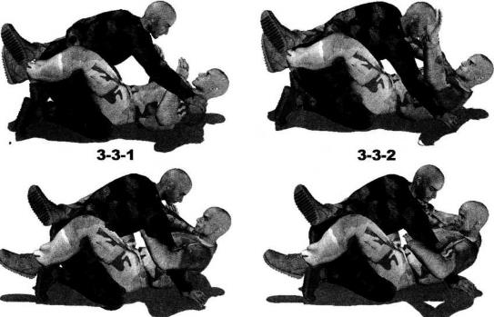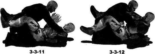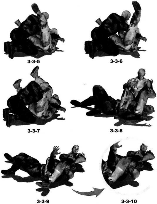 地面缠斗过程中我处于被动防守局面仰躺于地面对手跪伏于我两腿之间俯身伸出双手锁掐我脖颈或双肩我用双腿交叉勾锁住对方腰胯部位呈封闭式防守状态(图3-3-1)。我迅速将左臂抬起自对方双臂间穿过然后屈肘向左、向下划弧拨开其右臂(图3-3-2)。动作不停左臂屈肘内旋圈锁住对方右臂肘关节部位同时右手拍按住其右侧肩头(图3-3-3,图3-3-4)。然后双腿放松针对对手腰部的锁控臀部猛然向左侧辗转身体于地面上沿逆时针方向摆转右腿屈膝勾挂住对方左侧胸肋部使自己的身躯与对方的身躯形成垂直状态(图3-3-5)随即在用右腿压制住对方上体的同时左腿屈膝向上抬起以膝窝部位勾挂住对手脖颈部位(图3-3-6、图3-3-7)。继而双腿并靠夹住对手右臂一并用力向下压制对方的脖颈和胸肋部位置瞬间挺腰发力可将对手由跪伏状态翻转为仰躺之势。此时左肩向左后方摆动左臂屈肘夹紧对手右臂以小臂槌骨为力点向上提拉可以针对对方的右臂形成强力的直臂锁令其肘关节形成创伤(图3-3-8)。进一步双脚脚踝交叉勾搭在一起双膝内扣腰部挺直上体顺势向后仰躺将臀部贴紧对方的右肩胛骨部位以小腹、耻骨为支点用力向上抵顶对方大臂外侧形成十字臂锁(图3-3-9、图3-3-10)。