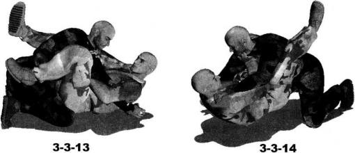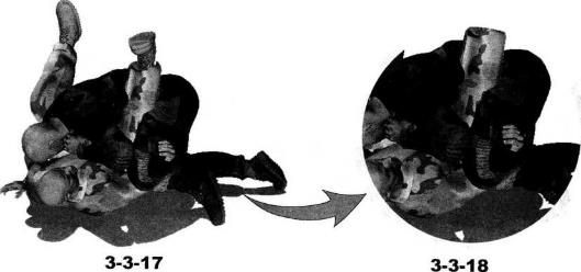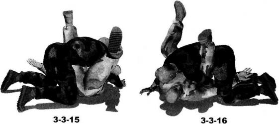 地面缠斗过程中我处于被动防守局面仰躺于地面对手跪伏于我两腿之间俯身伸出双手锁掐我脖颈或双肩我用双腿交叉勾锁住对方腰胯部位呈封闭式防守状态(图3-3-11)我迅速抬起双臂向上伸展自对方双臂间穿过然后屈肘向左、向下划弧拨开其右臂随即屈肘内旋圈锁住对方右臂肘关节部位同时右手拍按住其右侧肩头(图3-3-12-图3-3-14)。继而双腿放松针对对手腰部的锁控臀部猛然向左侧辗转身体于地面上沿逆时针方向摆转右腿屈膝勾挂住对方左侧胸肋部左腿屈膝抬起以大腿部位抵住对方右肩外侧使自己的身躯与对方的身躯呈垂直状态同时右手伸至对手左大腿内侧并屈肘揽住其左大腿后方膝窝部位(图3-3-15-图3-3-18)。动作不停右腿用力向下压制对方上体同时右手配合朝相同方向推送对手左腿周身协调动作瞬间可将对手由跪伏状态掀翻过来(图3-3-19)。在对方仰躺过来一刹那我左肩猛然向左后方摆动左臂屈肘夹紧对手右臂以小臂梅骨为力点向上提拉可以针对对方的右臂形成强力的直臂锁令其肘关节形成创伤(图3-3-20)。继而双脚脚踝交叉勾搭在一起双膝内扣上体向后仰躺将臀部贴紧对方的右肩胛骨部位以小腹、耻骨为支点用力向上抵顶对方大臂外侧形成十字臂锁(图3-3-21)。