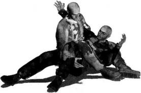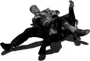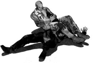 地面缠斗过程中我处于被动防守局面仰躺于地面对手跪伏于我两腿之间俯身伸出双手锁掐我脖颈或双肩发动攻击(图3-3-22)。在用左手控制住对方右臂的前提下双腿迅速抬起臀部猛然向左侧辗转身体于地面上沿逆时针方向摆转右腿屈膝勾挂住对方左侧胸肋部左腿屈膝以大腿部位抵住对方右肩外侧使自