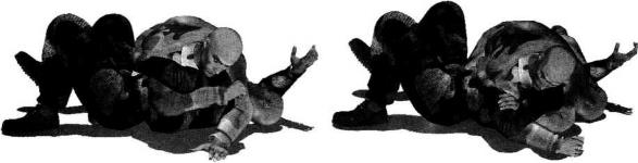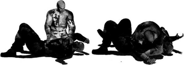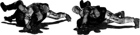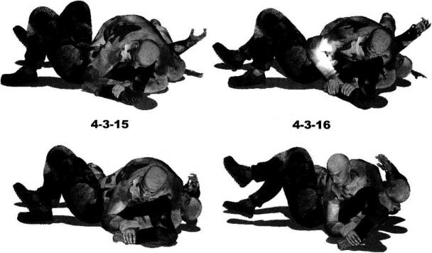 我利用投摔技术将对手仰面朝天摔倒后位于对手身体右侧并准备实施侧向压制(图4-3-11)。当我俯身朝对方躯干和胸部扑压下去并用双臂环抱其左臂的时候对手出于本能用左手抓住我右大臂外侧挣扎反抗(图4-3-12)。此刻我上身略微抬起抬头右臂屈肘向左上方抬起以小臂梅骨为力点撩起对手左臂施力于
