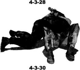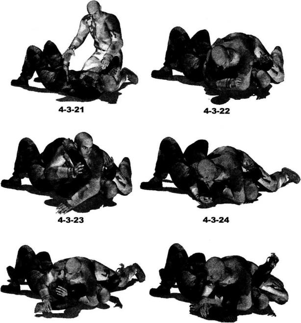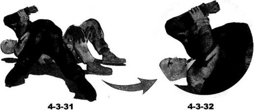 于地面利用身体的转动令双臂带动对方跟随我一同翻转令其上身趴伏于我躯干之上左臂反背于身后然后右手牢牢抓住对方左腕用力向左下方扣压同时以左小臂撬动对方被锁手臂的肩和肘关节部位形成仰躺状态下的弯曲臂锁(图4-3-30-图4-3-32)