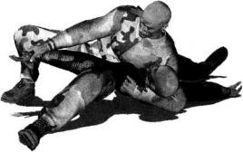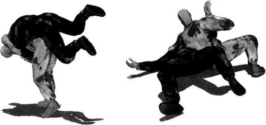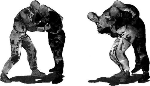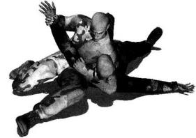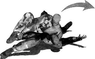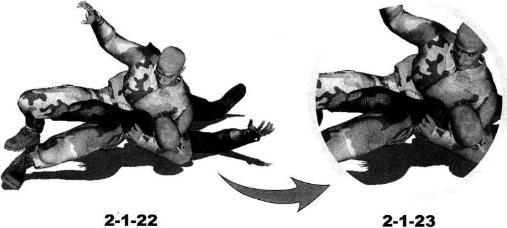 双方交手互相纠缠我用右手揽抓住对方左臂左手自对方右肩上方抄抓其后背(图2-1-16)。左脚向前上步身体猛然向右转动随即右脚向右后方移动俯身以臀部抵顶住对方腰胯部位后撅左臂夹紧对方脖颈随身体转动用力向右下方拉扯右手配合一并用力向右下方拉扯其左臂瞬间发力将对方由我身体左侧掀翻在地(图2-1-17、图2-1-18)。对方摔倒后我右脚迅速向右后方摆动左腿向左伸展穿插至对方左肩胛下方以左侧臀部着地同时右手顺势抓住对方左手(图2-1-19、图2-1-20)。继而在左臂牢牢控制住对方脖颈的前提下右手用力向前下方推送对方左手腕部使其直臂肘关节朝下置于我左大腿之上(图2-1-21)。动作不停右腿屈膝内扣以膝窝向下压制对方左手腕部针对其左臂肘关节实施直臂锁(图2-1-22、图2-1-23)。也可以抬起右脚以脚底踩踏住对手左手及腕部并用力下踩可以施加更大的力度将对手之左肘关节折断(图2-1-24,图2-1-25)。