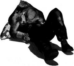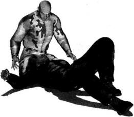 扣勾挂住对方右腿(图4-4-21)继而左臂屈肘与右臂合作牢牢扼紧对方右臂肘关节下端双臂用力收拢可以导致其右臂肘产生扭曲(图4-4-22)。用左脚勾挂住对方下肢的前提下双臂合拢扼紧对方右臂肘关节下端上体后仰可以使其右臂严重扭曲给对方造成的创伤也更加巨大(图4-4-23、图4-4-24)