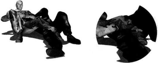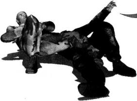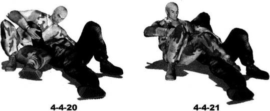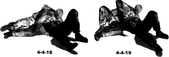 双方展开地面缠斗对手仰躺于地面我跪坐于对手头部上方(图4-4-16)突然俯身向前扑压用胸部抵压住对手胸部双手分别由对方两腋下插入到其腰部侧下方并牢牢抓住对方腰带或者衣服头部偏转一并压伏于对手躯干之上形成上方纵向压制(图4-4-17)。对方出于本能会用双臂环抱我上身我身体迅速向右翻转以左侧臀部着地右脚向右后方摆动左脚随势向左前方摆动(图4-4-18)。随即身体继续向右翻转右腿屈膝回收右臂伸展向右后方摆动以大臂后侧为力点向后挤别对方右臂迫使其放松对我的搂抱(图4-4-19)。动作不停左腿向左摆动右手托抓住对方右臂使其肘关节向内弯曲手腕被夹持于我右腋下(图4-4-20)。然后在左手牢牢搂抱住对方躯干的前提下抬起左脚插入对方双腿之间左脚内