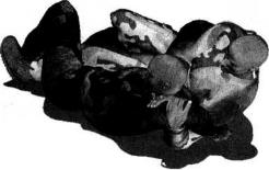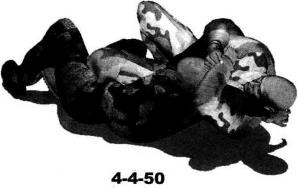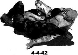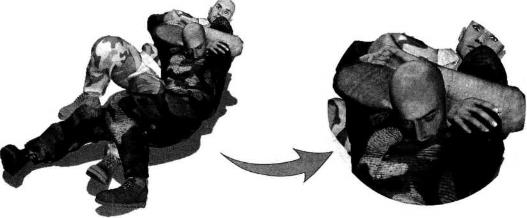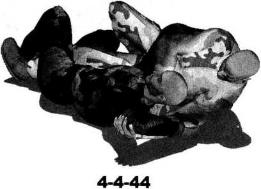 右手扣按住其右臂肘关节位置(图4-4-43)。紧接着右手自对方脖颈下方插入(图4-4-44),左臂屈肘收拢对方左臂使其肘关节弯曲小臂陷于我左臂肘窝之内同时右手尽量在对方颈下深度穿插直至右手能够抓住对方左臂根部迫使对方头部极度低头(图4-4-45、图4-4-46)。随即