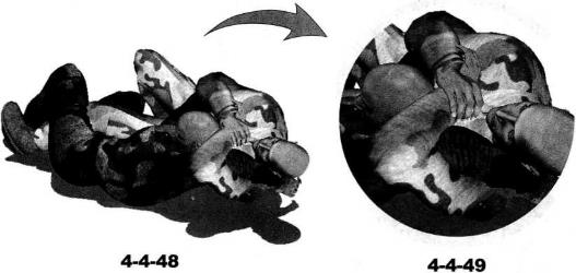 收拢左手内旋以手掌扣按住对方后脑部位右手顺势抽出同时头部向左压制其左小臂(图4-4-47)。右手抽出后可以抓住自己左手腕部双臂配合协调动作针对对方的脖颈实施别锁同时左臂的极度弯曲可以给对方左臂肘带来严重的创伤(图4-4-48-图4-4-52)。