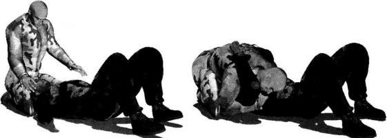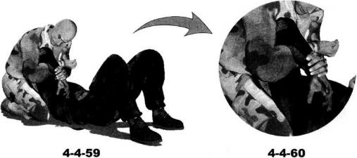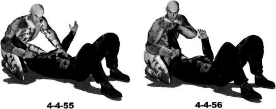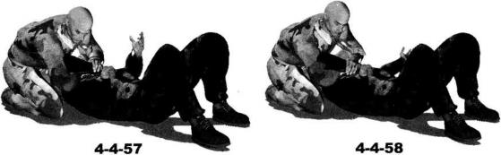 地面缠斗过程中对方仰躺于地面我跪坐于对手头部上方(图4-4-53)然后突然俯身向前扑压用胸部抵压住对手胸部头部偏转一并压伏于对手躯干之上形成上方纵向压制右臂屈肘揽抱住对方左臂准备发动攻击(图4-4-54)。对方出于反抗本能会用手臂推操我上体如果对手的反抗力度巨大我可以顺势上身抬起右手拉扯对方右臂令其直臂伸展(图4-4-55)。在右手揽住对方左臂肘关节部位的同时迅速抬起左手扣抓住其右手腕部(图4-4-56)。紧接着右臂屈肘揽住对方右臂肘关节位置左手用力向下扣压其右手手腕将其右臂肘关节别弯(图4-4-57)。继而右手顺势抓住自己左臂肘窝部位(图4-4-58)。然后身体略右转左手向下扣按右小臂向上向怀中提拉利用杠杆原理针对对方右臂实施弯曲臂锁(图4-4-59、图4-4-60)。
