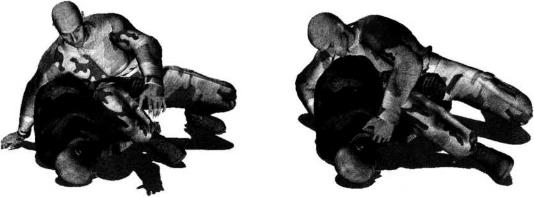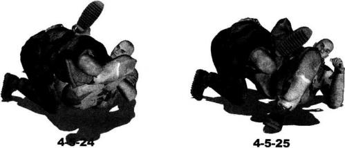 24) 。动作不停右腿用力向下压制对方左侧肩胛部位上体前探收腹瞬间将对方压倒以头触地(图4-5-25、图4-5-26)。身体继续前俯左手向身后伸展扶撑地面(图4-5-27)。然后左脚向左侧移动同时右手牢牢搂住对方腰背右腿继续用力向下压制以膝窝为力点压制对方左侧肩关节并使对方左臂腕部夹落于我左侧髓关节处(图4-5-28)继而身体向右移动重心左腿屈膝左脚后