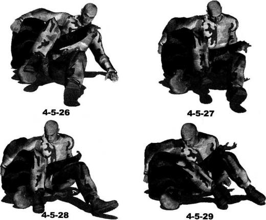 收右腿屈膝右脚后移双腿交错针对其左肩关节形成锁别(图4-5-29)。接下来迅速用左手抓住对方左手腕用力向右侧推送令其左臂弯曲(图4-5-30、图4-5-31)。随即身体前探右手扶撑地面以右侧髓部夹紧对方左手和小臂