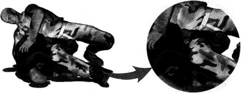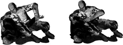 地面缠斗中我仰躺于地面对手双腿屈膝跪伏于我双腿之间对方上体前俯并用双手锁掐我脖颈发动攻击令我处于被动局面我迅速抬起双脚屈膝勾住对方腰胯部位双脚脚踝相交双腿呈环状将对方腰部锁住以封闭式防守应对同时双手屈肘扣按住对方双臂肘窝部位(图4-5-22)。随即身体向右摆动以后背为轴于地面上辗转左腿屈膝右腿随身体摆转向上抬起(图4-5-
