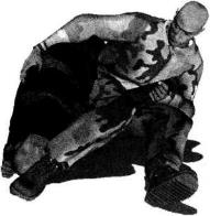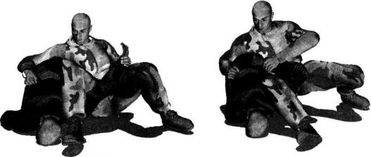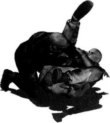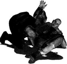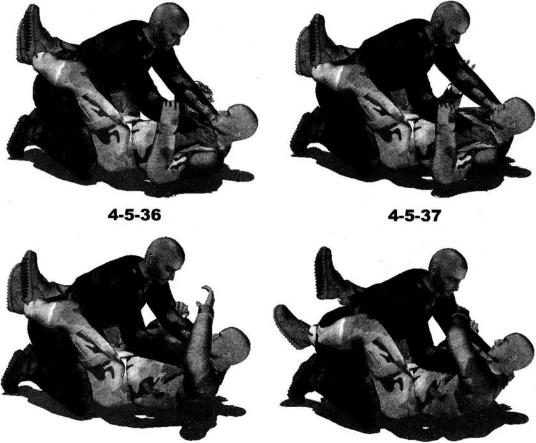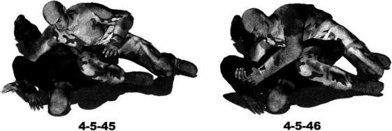 肩胛部(图4-5-41)。动作不停右腿继续以膝窝为力点用力向下压制对方左侧肩胛部位上体前探收腹瞬间将对方压倒以头触地。右手顺势搂住其身体右侧腰肋部左臂屈肘将其左臂揽至左胯侧并使其左臂腕部夹落于我左侧髓关节处(图4-5-42)。继而身体向右移动重心左腿屈膝左脚后收左手顺势抓住对方左手腕用力向右侧推送令其左臂弯曲(图4-5-43图4-5-44)。随即身体前探右手扶撑地面以右侧髓部夹紧对方左手及小臂右腿屈膝勾