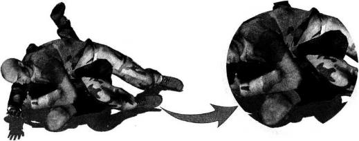 身体由对方身下辗转出来时要借助双腿的摆动双手牵制住对方双臂右腿推撑对方身体瞬间转出。转出后右腿要迅速向下压制并用右臂拉扯住对方的身躯。在针对其左侧臂肘形成锁时我右侧胸肋部一定要紧紧贴住对方左侧腰肋位置上体向右侧倾倒可以将臀部略微提起以加大挤靠的力度。右腿可屈膝向下别压对