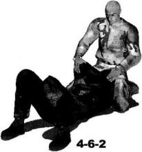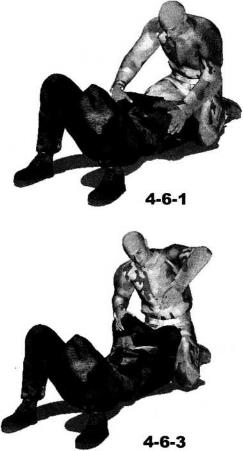 双方展开地面缠斗时对方被动仰躺于地面我跪坐于对手头部上方对方双臂弯曲交叉收抱于胸前防守严密使我一时无从下手发动攻击(图4-6-1)。我