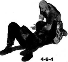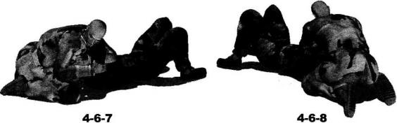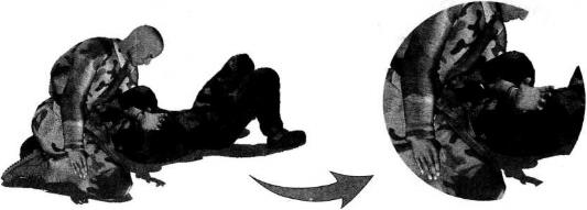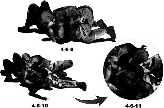 臂大臂部位(图4-6-7、图4-6-8)。继而上体向左侧摆动右臂随身体的摆动伸展至对方身体左侧然后屈肘以小臂扶撑地面(图4-6-9)。动作不停身体猛然向左侧翻转以腰胯的转动带动左脚向身体左后方摆动右腿随势向右前方摆动伸展以右侧臀部着地右手搂住对方左侧腰肋部左臂屈肘随身体的翻转夹持着对方右臂向左后方摆动针对其右臂肩和肘关节实施强力的别锁和扭曲令其产生难忍剧痛(图4-6-10、图4-6-11)。