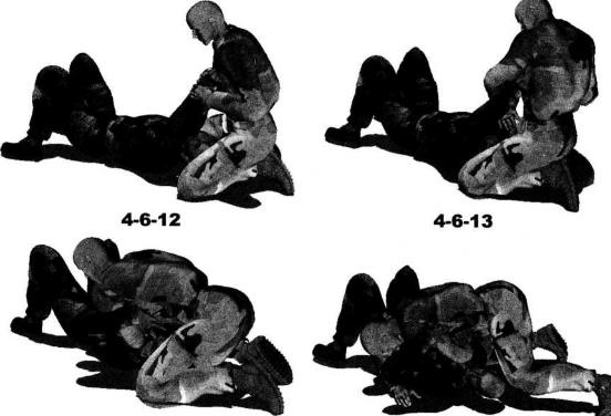 双方展开地面缠斗时对方被动仰躺于地面我跪坐于对手头部上方我准备实施纵向的压制但对手伸出双手进行推阻或者抓扯我胸前衣襟进行反抗(图4-6-12)。在对方双手抓住